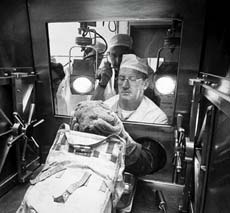 Крупный образец породы, только что доставленный на Землю «Аполлоном-16», извлекается из «лунного рюкзака» в приемной лаборатории в Хьюстоне. |
