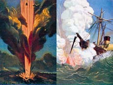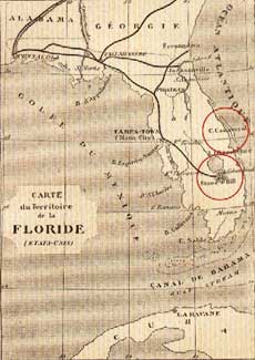 Иллюстрации из книги Жюля Верна (издание 1918 года) показывают старт лунной экспедиции и ее возвращение — падение в океан. На карте Флориды из книги Ж. Верна в центре нижнего круга — расположение фантастической пушки, а в центре верхнего круга ныне находится реальный космодром на мысе Канаверал (Cape Canaveral). |