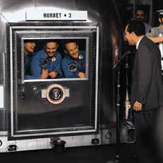 Президент США Никсон на борту авианосца приветствует находящийся в защитной кабине экипаж «Аполлона-11». |