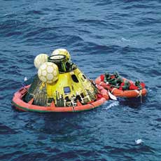 Отсек с астронавтами приводнился в Тихом океане юго-западнее Гавайских островов, неподалеку от атолла Джонстон. Планировалось, что эвакуацию космического корабля из океана выполнит авианосец «Джон Кеннеди», носящий имя того, кто положил начало программе «Аполлон». Однако президент Никсон, которому предстояло встречать астронавтов, не захотел, чтобы эта встреча ассоциировалась с именем его предшественника, и послал в район приводнения авианосец с нейтральным именем «Хорнет» («Шершень»), на палубе которого он и приветствовал вернувшихся с Луны. Сразу же, прямо в океане, на астронавтов были надеты биоизоляционные костюмы, чтобы избежать опасности заражения Земли возможными лунными микроорганизмами. В этих костюмах их перевезли на вертолете на авианосец, где поместили в герметичную кабину для прохождения карантина. Сидя в этой камере с большим стеклянным окном, они и общались по телефону с находившимся снаружи американским президентом.