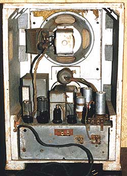 All the RF and oscillator coils are assembled as a separate screened section fastened to the chassis with four screws. The tuning cap has four sections and is installed on shock absorbing layings and covered with a cardboard case. The band selector is 3-plated. The loudspeaker is dynamic-type, with the series sourcing of the field coil. The outer transformer is inclosed in a case and put on the "basket" of the loudspeaker.