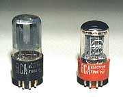 The glass analogs of the European metallic valves with outer screening coating. On the photo: 6SQ7 è 6SJ7.