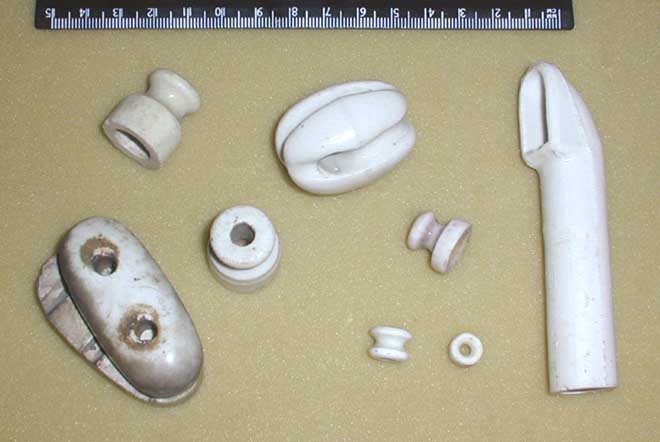 Фарфоровая арматура для монтажа антенны, снижения, заземления и вводов в здание. "Орешек", ролики, трубчатый ввод и двойной изолятор для закрепления неизолированной проводки. 1940-1970 годы. |