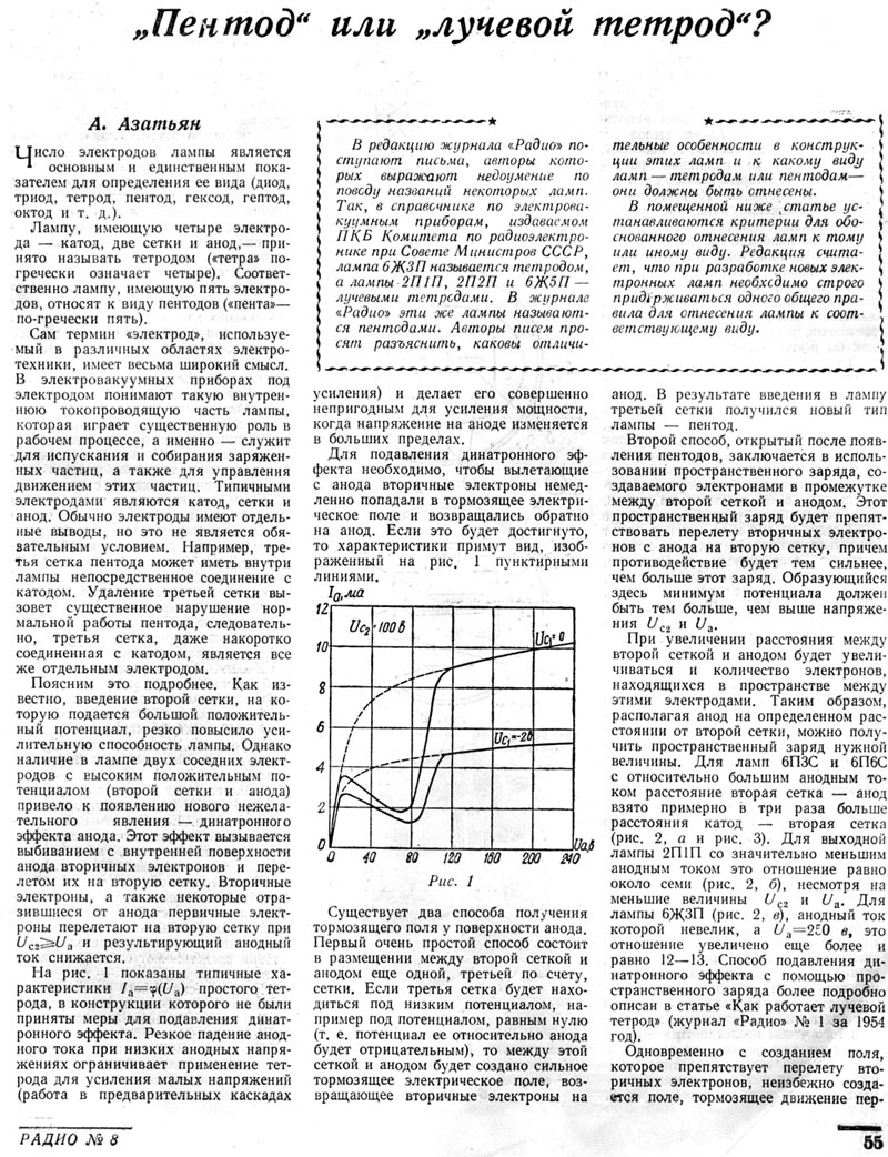 ("Радио", №1, 1955 год, c. 47)Пентод или лучевой тетрод?