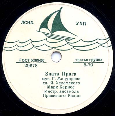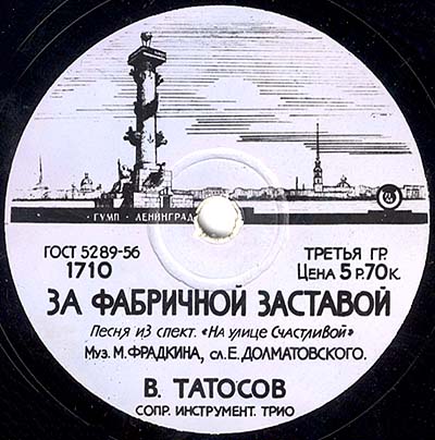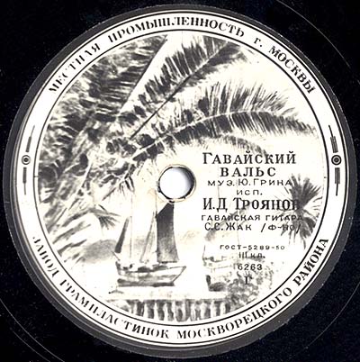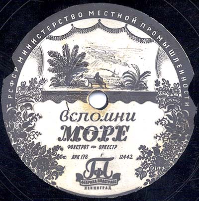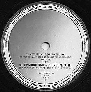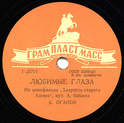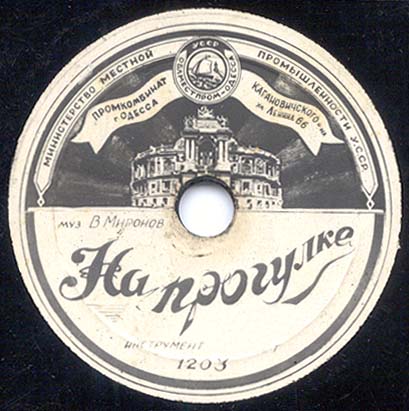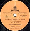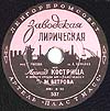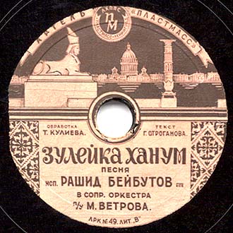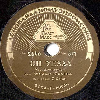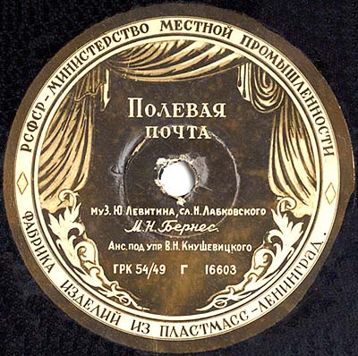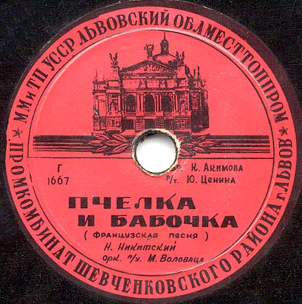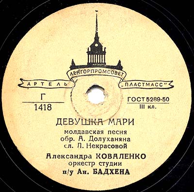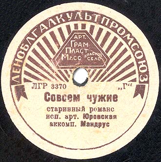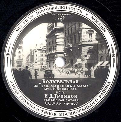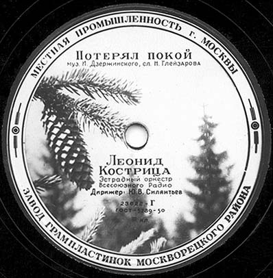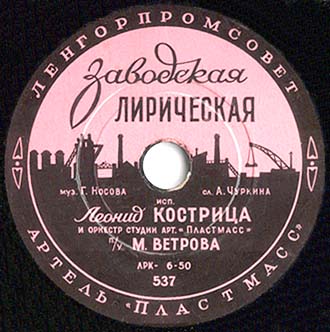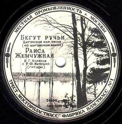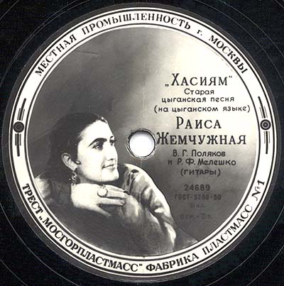 Plastics Factory No. 1 of "Mosgorplastmass" Trust was another Moscow enterprise producing gramophone disks. The label shows a photo of Raisa Zhemchuzhnaya - a well-known performer of Gypsy romances. |