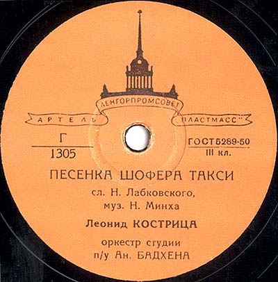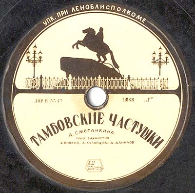 Big editions of plates were turned out by "Plastmass" artel (factory) on Sinopskaya (Kalashnikovskaya) embankment in Leningrad. You see two of the labels on disks of "grand" size produced by that factory in 1945-1949. The right label was printed in many versions of the topic, some of them are shown here. |