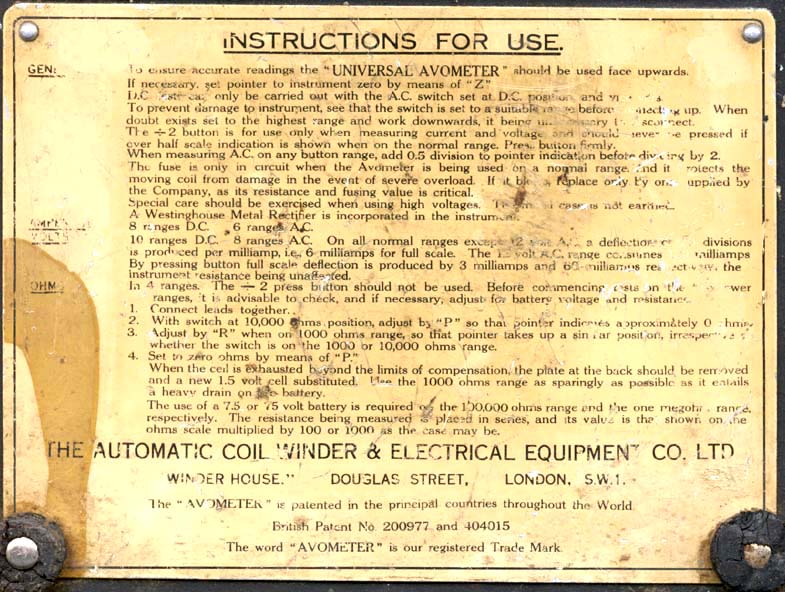 В заключительной части инструкции, после адреса фирмы-изготовителя, имеются данные о патентной поддержке конструкции прибора. Помимо перечисления Британских патентов № 200977 и 404015, примечательно упоминание о том, что на момент производства прибора была запатентована не только его конструкция "в основных странах мира", но и само слово AVOMETER ("авометр") являлось зарегистрированной торговой маркой фирмы-изготовителя данного прибора. В сочетании с отсутствием номера модели вышесказанное с большой вероятностью позволяет предположить, что описанный измерительный прибор является первым в мире представителем многофункциональных многопредельных измерителей электрических величин - авометров, получивших в дальшейшем широкое распространение. |