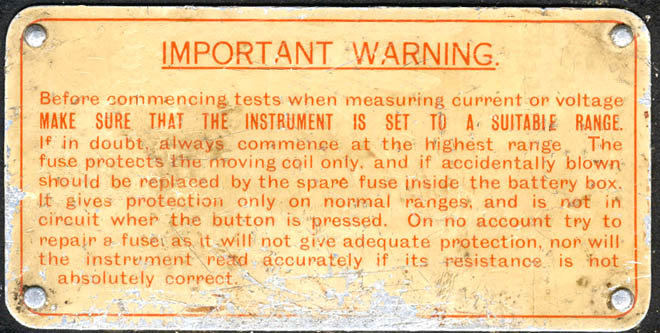 | На задней и нижней поверхности корпуса имеются два шильда с текстом, сзади - предупреждения о безопасном использовании, снизу - инструкция по работе с прибором. Предупреждения включают указания по приемам безопасной работы и по смене плавкой вставки. Инструкция, помимо полных технических данных прибора, включает описание правил работы с ним. Увеличьте фото для прочтения текстов. |