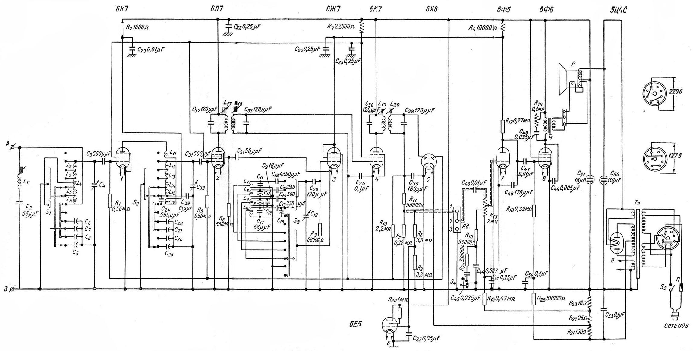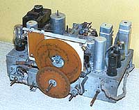 (Получить - 285 КБайт jpeg)Первая лампа 6К7 работает в качестве усилителя радиочастоты. Гетеродин-осциллятор собран на лампе 6Ж7 по трехточечной схеме, смеситель - на пентагриде 6Л7. После усилителя промежуточной частоты (6К7) сигнал детектируется диодом лампы 6Х6. Предварительный усилитель звуковой частоты собран на триоде 6Ф5, оконечный - на пентоде 6Ф6. Регулятор громкости имеет тонкомпенсацию на низких частотах. Громкоговоритель - с подмагничиванием и антифонной катушкой. В качестве индикатора точной и бесшумной настройки традиционно использована лампа 6Е5 (ранней версии, с "американским" цоколем). Постоянные резисторы - ТО с цветовой маркировкой номинала, конденсаторы - слюдяные опрессованные. и бумажные ( тогда еще не имевшие названия типа, впоследствии известные, как "КБ").