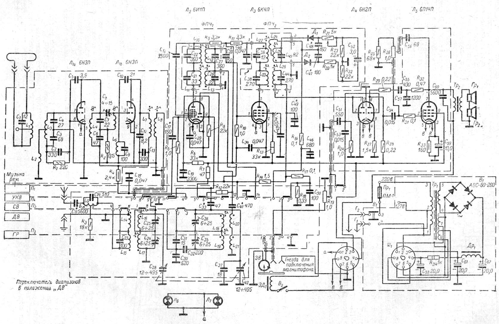 Набор ламп: 6Н3П, 6И1П, 6К4П, 6Х2П, 6Н2П, 6П14П, селеновый мост АВС-80-260
