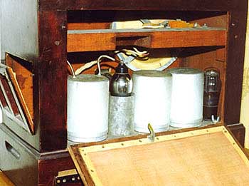 The set was put into a massive wooden cabinet made of plankets cogged together. The upper part of the case is removable. To insure access to the tubes the lid has two detachable hatches from behind and on the right side. They are draped with grill cloth.The base of the cabinet which has a function of the chassis is covered by a veneer lid from below.