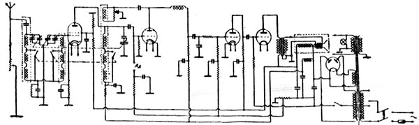 The R-set is built according to the structure of direct amplification 1-V-2 with controlled positive feedback using tubes of the indirect 4-volts heating. The RF amplifier on a tetrode SO-124 has the cap coupling with the aereal. A SO-118 tube works as the detector. The first AF step is built on a similar tube. The output audio step is working on a direct heating triode UO-104. The scheme is sourced on a rectifier VO-116. All the resistors are carbonic ("Kaminsky" type). The filter caps are paper-made (Leningrad "Krasnaya Zarya" Works), the rest are of open construction made of mica.