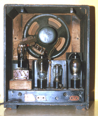 The set is assembled in a case made of plywood with black "chagrene" covering (there were some sets covered with artificial leather). The removable back cover made of veneer with ventilating holes is fastened with two screws and gives access to the chassis with the tubes installed in one row. Unscrewing of the right screw disconnects the net current.