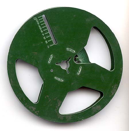 Основным неудобством при работе с лентой были постоянные разрывы - склейка ленты в те времена стала привычным занятием любителей звукозаписи. Резкий запах "магнитофонного" клея (а туда входили такие компоненты, как ацетон, бутилацетат, уксусная эссенция) обычно сопровождал процесс прослушивания. Лента типа 1 обеспечивала приемлемое качество записи на скорости не менее 19,05 см/с. Справа показана стандартная алюминиевая катушка емкостью 100 м (диаметром 10,5 см) для магнитофонных приставок. |