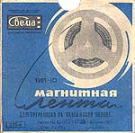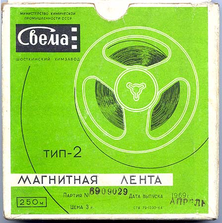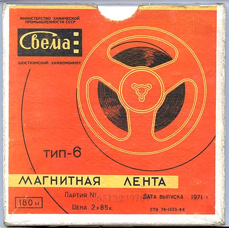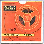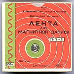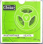 На ленту типа 2 были рассчитаны все магнитофоны конца 1950-х - начала 1960-х годов - базовые модели "Комета", "Астра", "Тембр", "Айдас", "Гинтарас" и многие другие. Они были уже двухдорожечными - перевернув катушки по окончании воспроизведения можно было перейти на вторую дорожку. Возможность использования двухкратно более узкой дорожки - плод увеличения чувствительности новой ленты. На коробке виден более современный логотип Шосткинского химкомбината - "СВЕМА". |