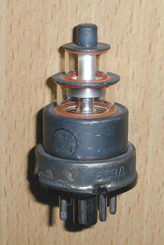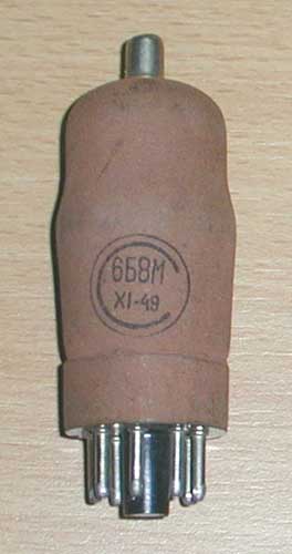 6Б8М. Кто теперь помнит, что маркировка первых версий этой лампы имела на конце букву "М", аналогично лампам малогабаритной серии (2К2М, 2Ж2М)... Тем более, что ее внешняя и внутренняя арматура почти полностью совпадает с батарейными "предками". Завод "Светлана", 1949. |