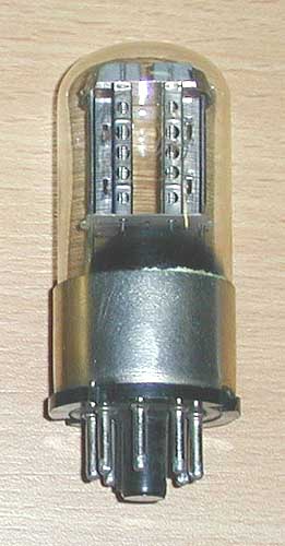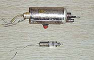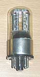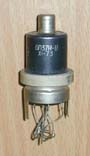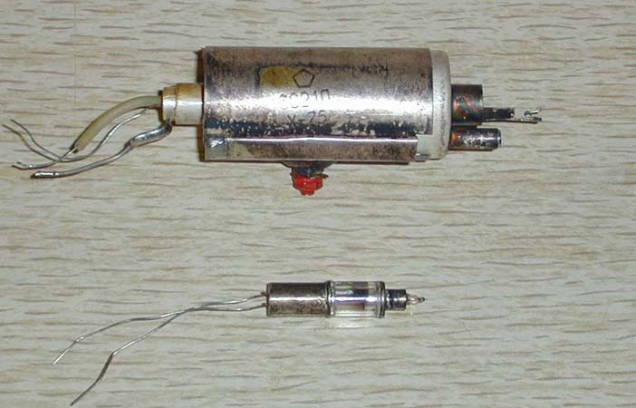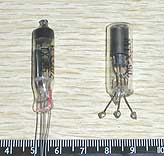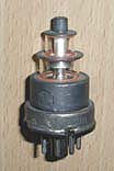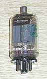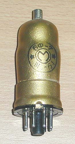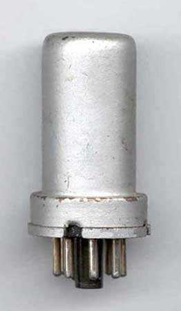 6Ф-7. Эта частотнопреобразовательная лампа своей маркировкой напоминает о периоде (конец 1940-х), когда в написании типов использовался дефис. Уникальное сочетание: баллон ламп серии малгабов смонтирован на цоколе октальной металлической радиолампы. Московский электроламповый завод, 1961. |