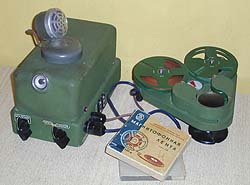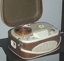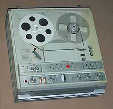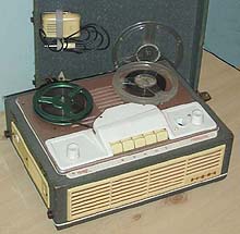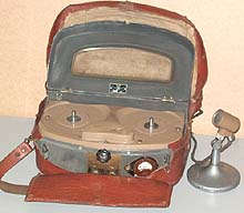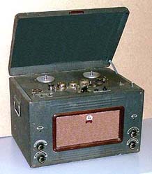 Профессиональный переносный ламповый магнитофон с питанием от батарей. Запись – однодорожечная, на скорости 19,05 см/с. Прослушивание – на головные телефоны или через внешний усилитель. Магнитофон не имеет генератора стирания, для повторной записи требуется предварительное размагничивание ленты. Уровень записи контролируется по стрелочному индикатору. Для питания используются две батареи - анодная-накальная и для питания двигателя (15РММЦ-12ч). Магнитофон работает с микрофоном МД-44. имеет защитный кожаный чехол для экспедиционной работы. Максимальный типоразмер катушек – “13” (на 180 м ленты). Набор ламп - 2П1П – 3 шт., 0,6П2Б – 4 шт. 1959 год.