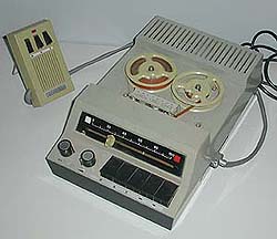Профессиональный сетевой диктофон на полупроводниковых приборах. В комплект входит педаль управления, дистанционный пульт для оператора машинописи, отдельный коммутатор входов, выносное микрофонно-воспроизводящее устройство (на фото), беспроводной индукционный адаптер для записи телефонных переговоров. Диктофон имеет автоматическую регулировку уровня записи, звуковую сигнализацию за 30 секунд до окончания ленты, механический указатель текущей позиции записи. Типоразмер катушек – “7,5” (50 метров ленты типа “6”). Запись – двухдорожечная при скорости 4,76 см/с. Аппарат собран на семи транзисторах и восьми полупроводниковых диодах. Масса диктофона – 4,5 кг. Модель 1969 года.