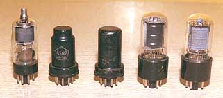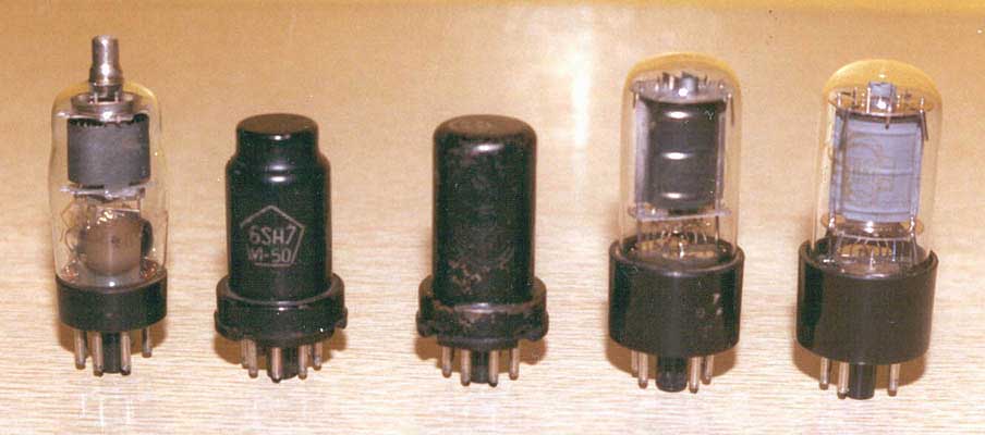 справа - отечественные Z-62-D (впоследствии - 6Ж6С), 6SA7 (6А7), 6SR7 (6Г1), 6V6GT (6П6С)
