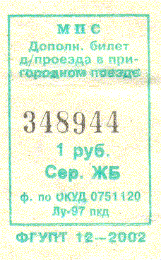 Билет на проезд в пригородном поезде. 1 руб. 2002 г.