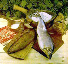 Лепешку раскатывают толщиной в 1 см., на нее кладут свежую подсоленную рыбу, добавляют сливочное масло, заворачивают лодочкой, края защипывают и выпекают в духовке.